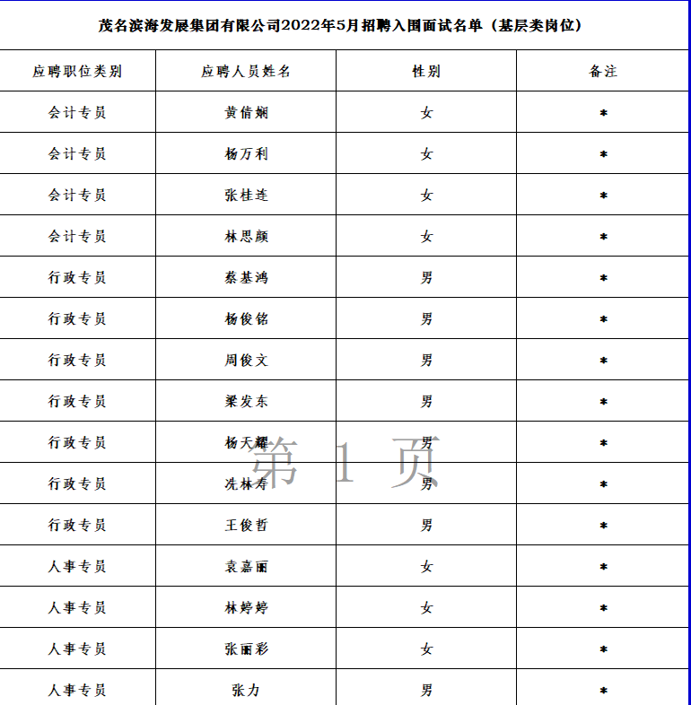 茂名濱海發展集團有限公司2022年5月入圍面試名單公示