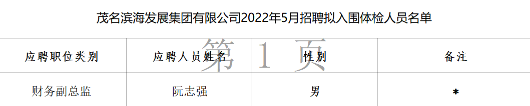 茂名濱海發展集團有限公司2022年5月招聘擬入圍體檢名單公示